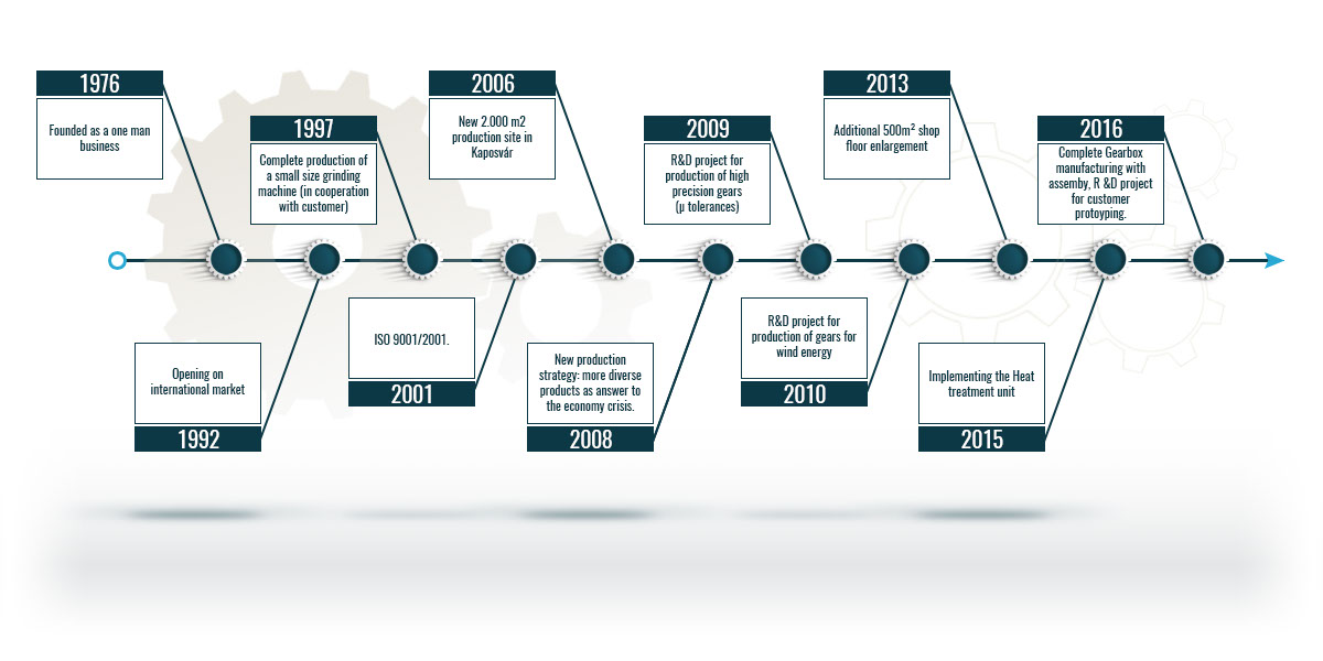 For over 40 years, Szabó Gear Manufacturing Ltd. (Szabó Fogaskerékgyártó Kft.) has been producing high quality gears. Originally started as a “one man business” by the owner Ferenc Szabó, our organization has grown and developed to employ 50 highly skilled and experienced employees dedicated to producing the finest quality as demanded by the marketplace. Our organization specializes in Gear Manufacturing and Gearbox production, we deliver Geared Parts, undertake Machining, we also perform Heat Treatment on our gears.